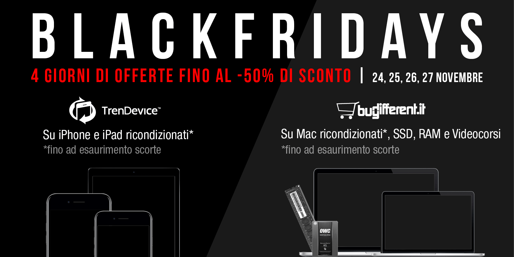 Gli sconti sono già online, quindi se volete acquistare iPhone e iPad collegatevi subito al sito TrenDevice oppure registratevi alle alert per rimanere aggiornati sulle offerte e gli sconti che si alterneranno durante questi 4 giorni di BlackFridays. Se invece siete interessati ad un nuovo Mac, oppure gli upgrade per potenziare il vostro computer collegatevi sul sito BuyDifferent o registratevi alle alert per non perdere le anteprime delle offerte.