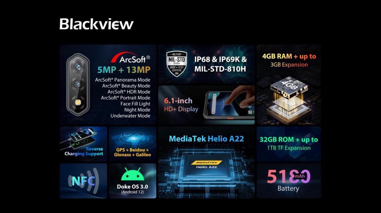 Questo smartphone è praticamente la versione aggiornata del Blackview BV4900. Leggero e più sottile, monta un display HD+ da 6.1 pollici, usa Doke OS 3.0 su Android 12 ed è alimentato da una batteria da 5.180 mAh, con CPU MediaTek Helio A22 quad-core, e fino a 7 GB di RAM.