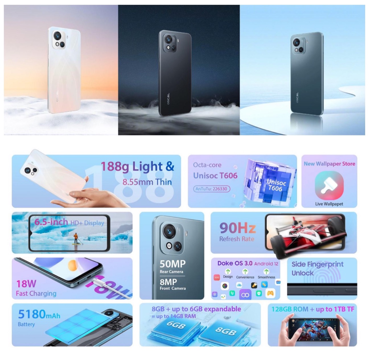 Gira con Doke OS 3.0 basato su Android 12 e usa una batteria da 5.180 mAh, Forse la caratteristica più evidente è il corpo ultrasottile, spesso soltanto 8.55 mm, e il fatto che è ultraleggero (pesa 188 grammi). E’ disponibile in tre varianti di colore, Early Sunny Snow, Midnight Black e Navy Blue, che lo rendono accattivante per i giovani e per chi in uno smartphone cerca anche freschezza e stile.