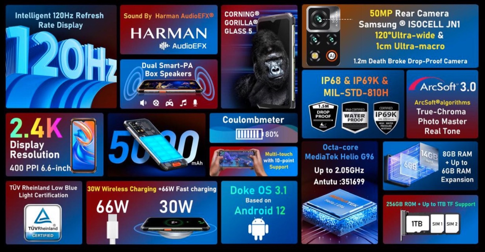 Il telefono fa parte della categoria rugged e si chiama Blackview BV9200: monta uno schermo da 6.6 pollici, fotocamere Arcsoft e audio Harman AudioEFX, con una batteria da 5.000 Amh con ricarica via cavo da 66 Watt e senza fili da 30 Watt, processore MediaTek Helio G96 e interfaccia Android firmata Doke 3.1. Le sue caratteristiche di punta sono sostanzialmente cinque: