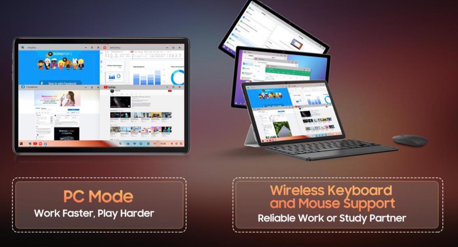 Per chi intende lavorarci c’è la modalità PC con supporto a tastiera e mouse wireless che permette di trasformarlo rapidamente in un portatile.