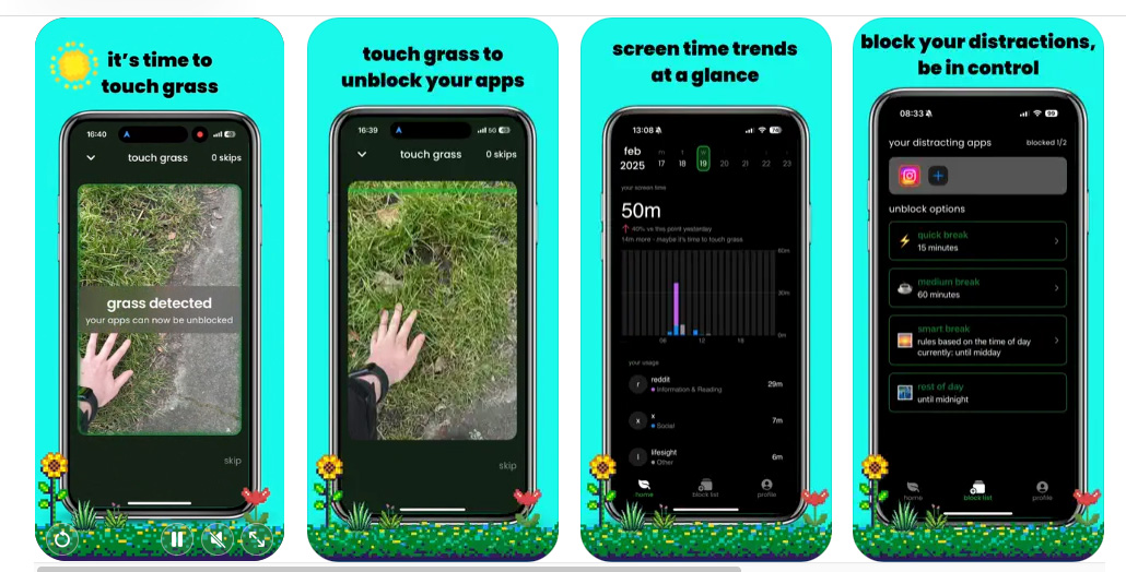 Touch Grass è un’app pensata per diminuire la dipendenza da smartphone, una condizione psicologica che può svilupparsi in tanti soggetti che non riescono a rimanere ‘sconnessi’/’allontanati’ dal cellulare e non fanno altro che scrollare tutto il giorno compulsivamente il telefono.