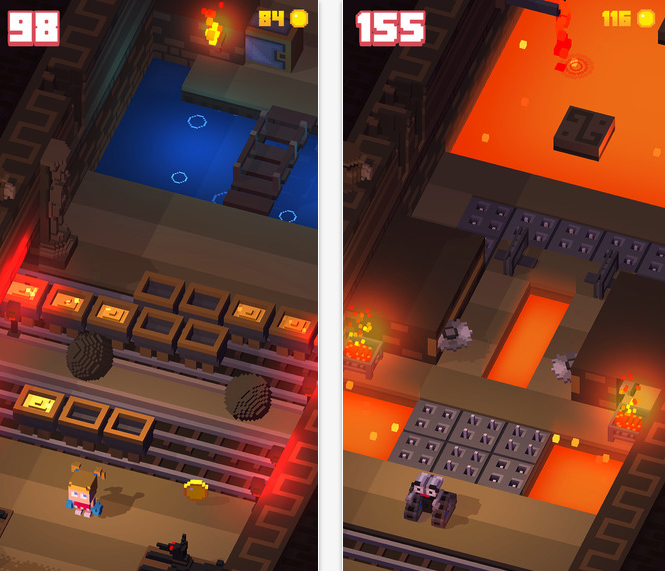 Del resto, già il Raider presente nel titolo farebbe pensare alle atmosfere avventurose tipiche del brand Tomb Raider, ed in effetti così è. Ad ospitare la corsa infinita del personaggio, o meglio dei personaggi, sarà un misterioso tempio antico, ricolmo di tesori, ma anche di trappole e nemici da schivare a tutti i costi. Sembra quasi di percorrere uno dei dungeon di Zelda, con luci basse e soffuse, pipistrelli e nemici vari che svolazzano all’interno della caverna. Questo elemento conferisce al titolo una lieve, anzi lievissima, nota di originalità, dato che il giocatore non dovrà solo preoccuparsi del traffico che invade lo schermo in linea orizzontale. Ed infatti, le trappole cui badare questa volta sono molteplici: carrelli zeppi d’oro che attraversano i binari, pesci che sbucano fuori dall’acqua, ponti da attraversare, lame rotanti da schivare, palle infuocate da cui tenersi alla larga, e così via. Proprio la diversità di ostacoli da affrontare restituisce una sensazione di gioco platform, anche se in realtà si tratta dello stesso endless già apprezzato in Crossy Road.