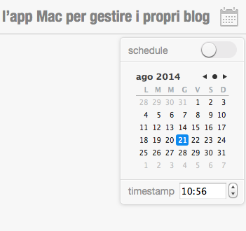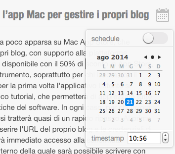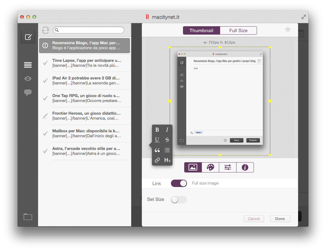 La finestra per l’inserimento dei contenuti è davvero basilare, ma non mancano le opzioni per poter personalizzare il proprio testo. Un click sull’area di scrittura consentirà di inserire collegamenti ipertestuali a parole o frasi, oppure di modificare il font del proprio testo o ancora di inserire elenchi puntati. Con un click con il tasto destro sarà possibile inserire velocemente immagini, potendo anche modificarle a proprio piacimento grazie ad un apposito editor integrato. Interessante notare, che proprio come avviene sulla piattaforma web di WordPress, anche Blogo supporta il drag and drop delle immagini, così da poter caricare immediatamente una foto all’interno dell’articolo, semplicemente trascinando il file multimediale dalla cartella del proprio Mac alla finestra di scrittura. Dopo aver completato il proprio testo, sarà possibile salvarlo come Bozza o pubblicarlo direttamente, grazie ai pulsanti rapidi presenti sulla parte inferiore, potendo anche decidere se inserire un’immagine in evidenza da far apparire in Home, o meno.