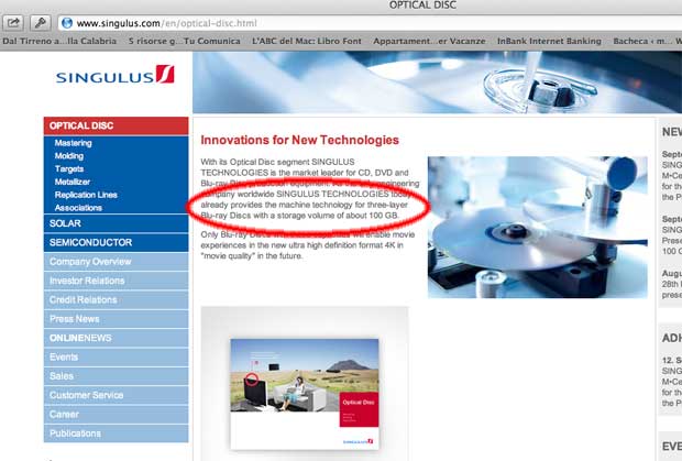 Singulus Technologies, un produttore di apparecchiature per la duplicazione di CD e DVD, ha forse inavvertitamente rivelato in anticipo un nuovo supporto Blu-Ray da 100GB: in uno dei dispositivi pubblicizzati si parla infatti d’inesplicabili dischi Blu-ray a tre strati con capacità da 100 GB, probabile prova dell’arrivo di estensioni per il supporto della risoluzione 4K (3840 x 2160 pixel). Non si spiegherebbe altrimenti a cos’altro potrebbe servire un macchinario per la duplicazione di questa tipologia di supporti.