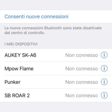 Ciò è confermato dal pannello Impostazioni dove, sebbene nel Centro di Controllo l’icona Bluetooth sia per l’appunto spenta, nel tab Bluetooth l’interruttore risulta invece ancora attivo. In questa particolare situazione compare però un nuovo pulsante denominato Consenti nuove connessioni che, se cliccato, riattiva il Bluetooth, riaccendendo l’icona nel Centro di Controllo.