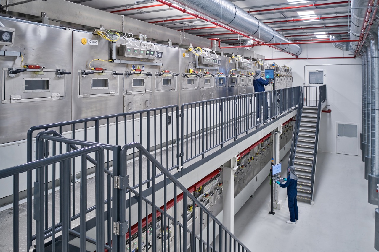La produzione delle celle inizia con la produzione degli elettrodi. Qui il materiale di base, che comprende, ad esempio, grafite per l’anodo e ossidi di nichel per il catodo, con leganti e solventi, viene dosato e mescolato in un rapporto misurato con precisione. In questo modo si crea il cosiddetto “slurry”, ovvero lamine metalliche sottilissime che vengono rivestite e poi compresse dopo l’essiccazione. In gergo tecnico, questa operazione viene definita “calandratura”.