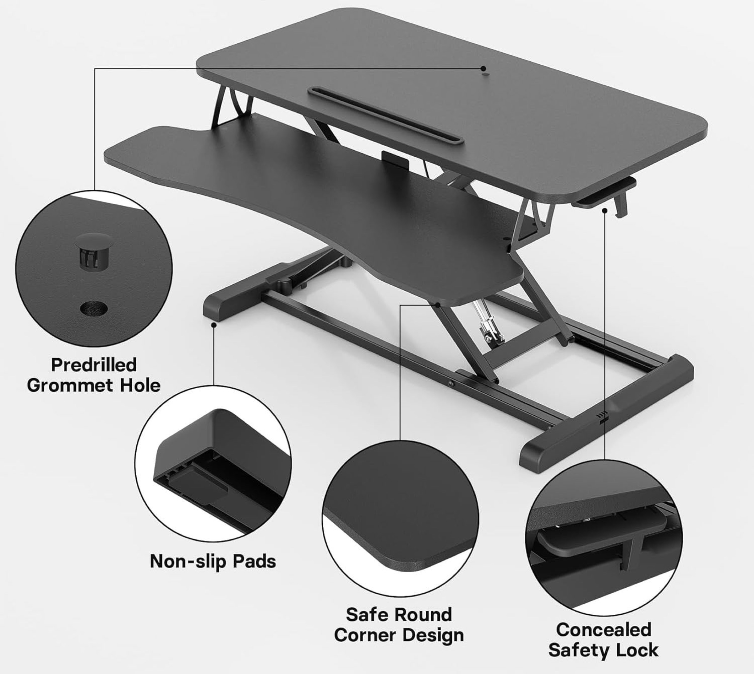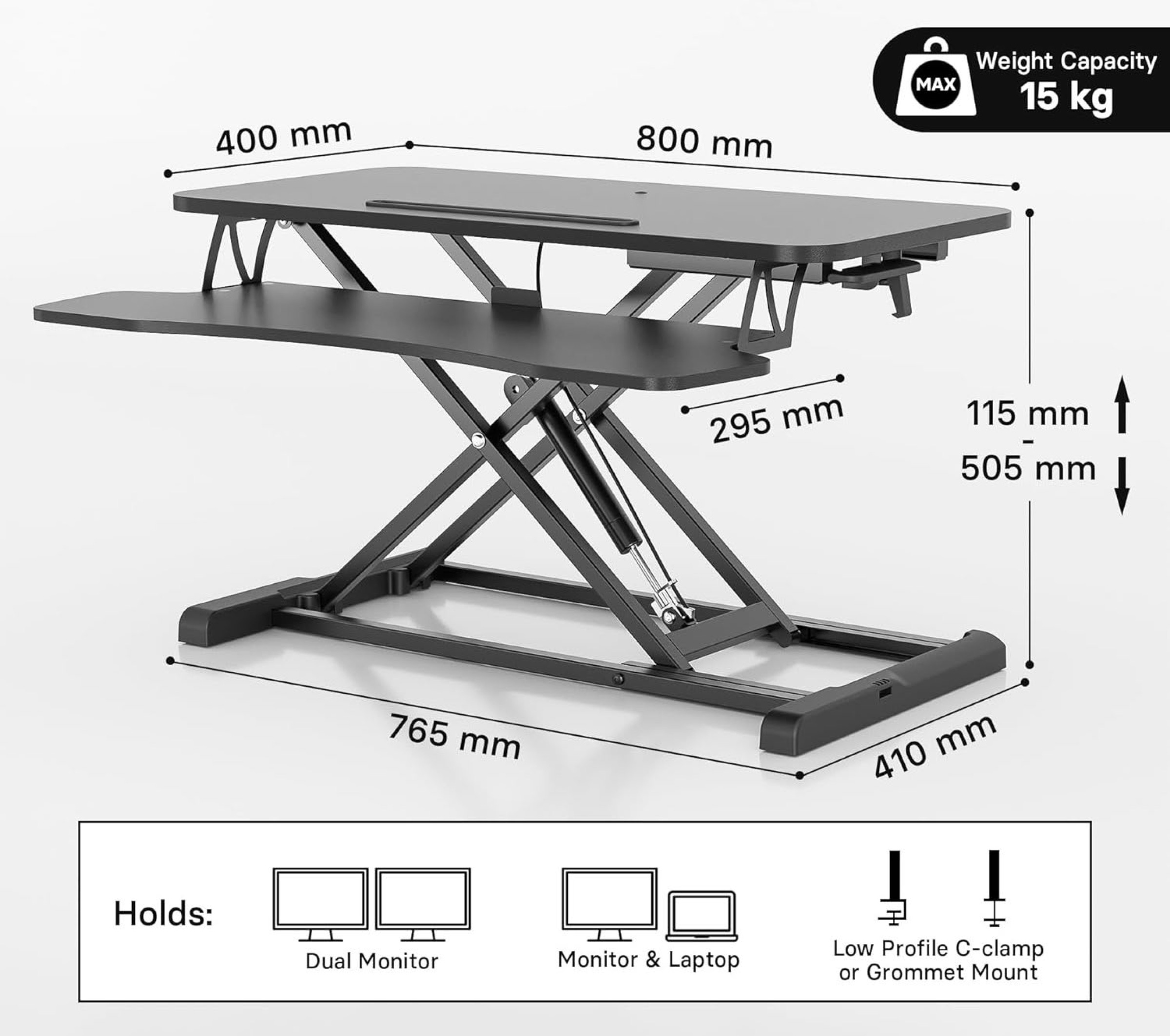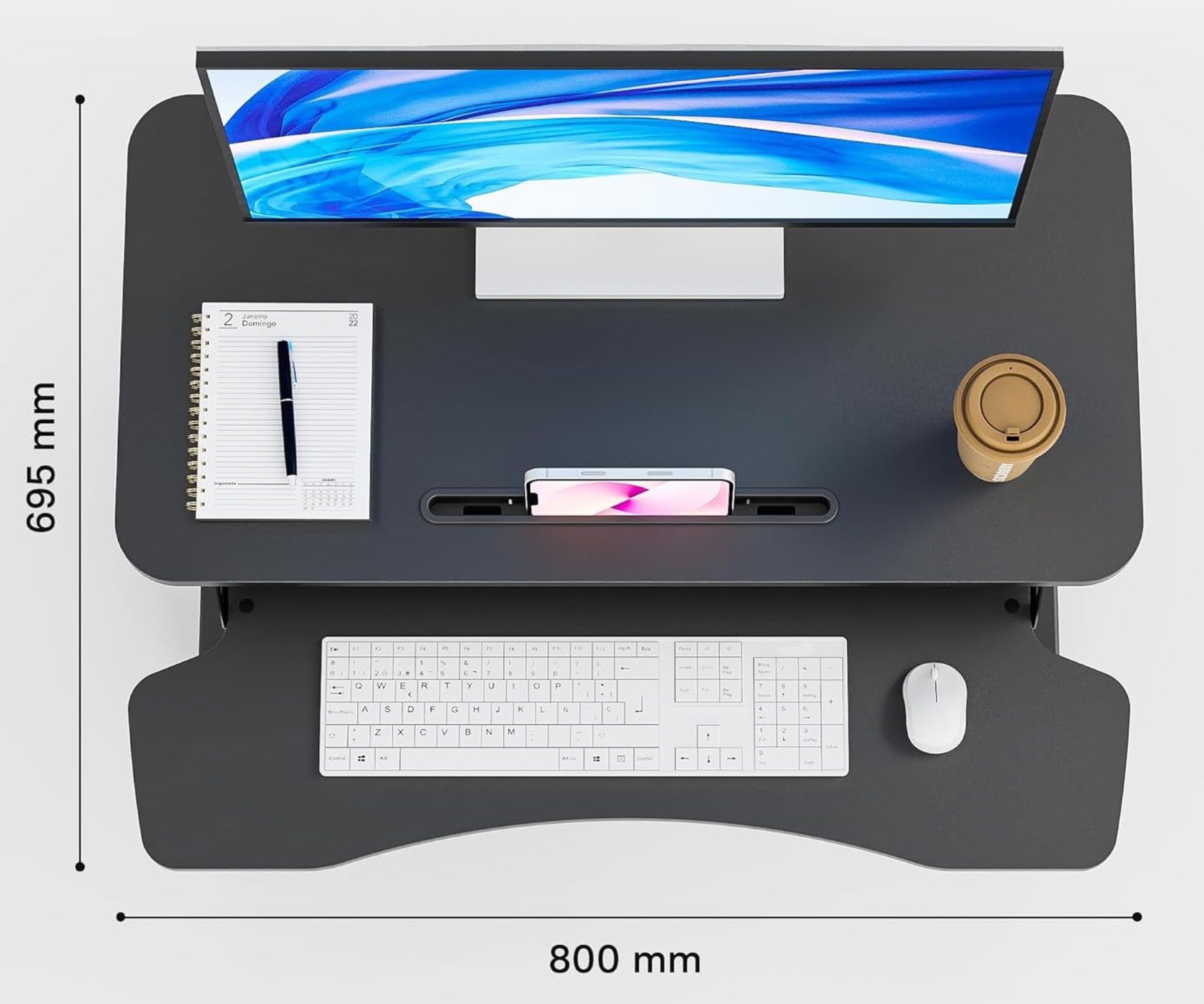 Nell’acquisto considerate che la base ha bisogno di almeno 76,5 x 41 centimetri di spazio sulla scrivania, ma vanno considerati 3-4 centimetri in più di margine ai lati per poter regolare l’altezza senza impedimenti.