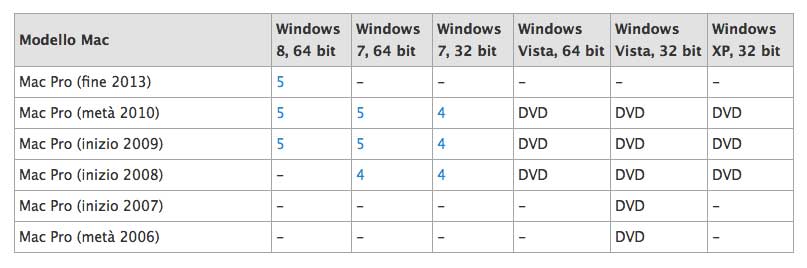 Sfruttando Boot Camp sui nuovi Mac Pro 2013, non è ufficialmente possibile installare vecchie versioni di Windows in una partizione dedicata usando l’utility Assistente Boot Camp. I requisiti generali necessari per l’installazione di Microsoft Windows tramite Boot Camp, variano da sistema a sistema e in base al Mac usato sono supportate alcune versioni di Windows e altre no.