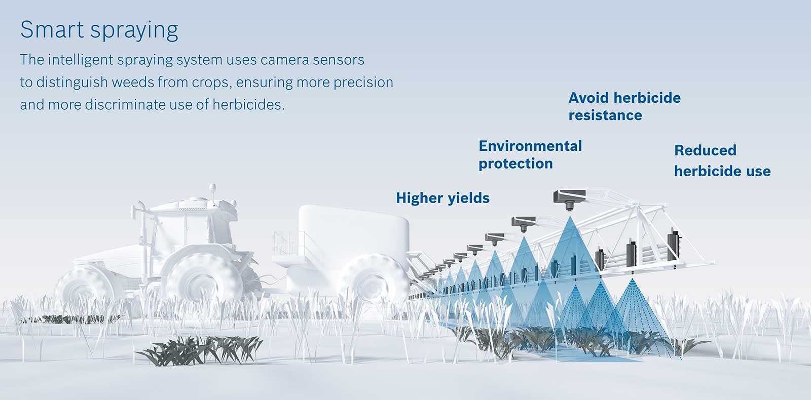 Il concetto di smart spraying di Bosch e xarvio si concentra sull’applicazione mirata di erbicidi sui campi, allo scopo di tenere sotto controllo le piante infestanti. Smart spraying offre un sistema “intelligente” in grado di distinguere le piante infestanti dalle colture e applicare dei diserbanti in maniera diretta.