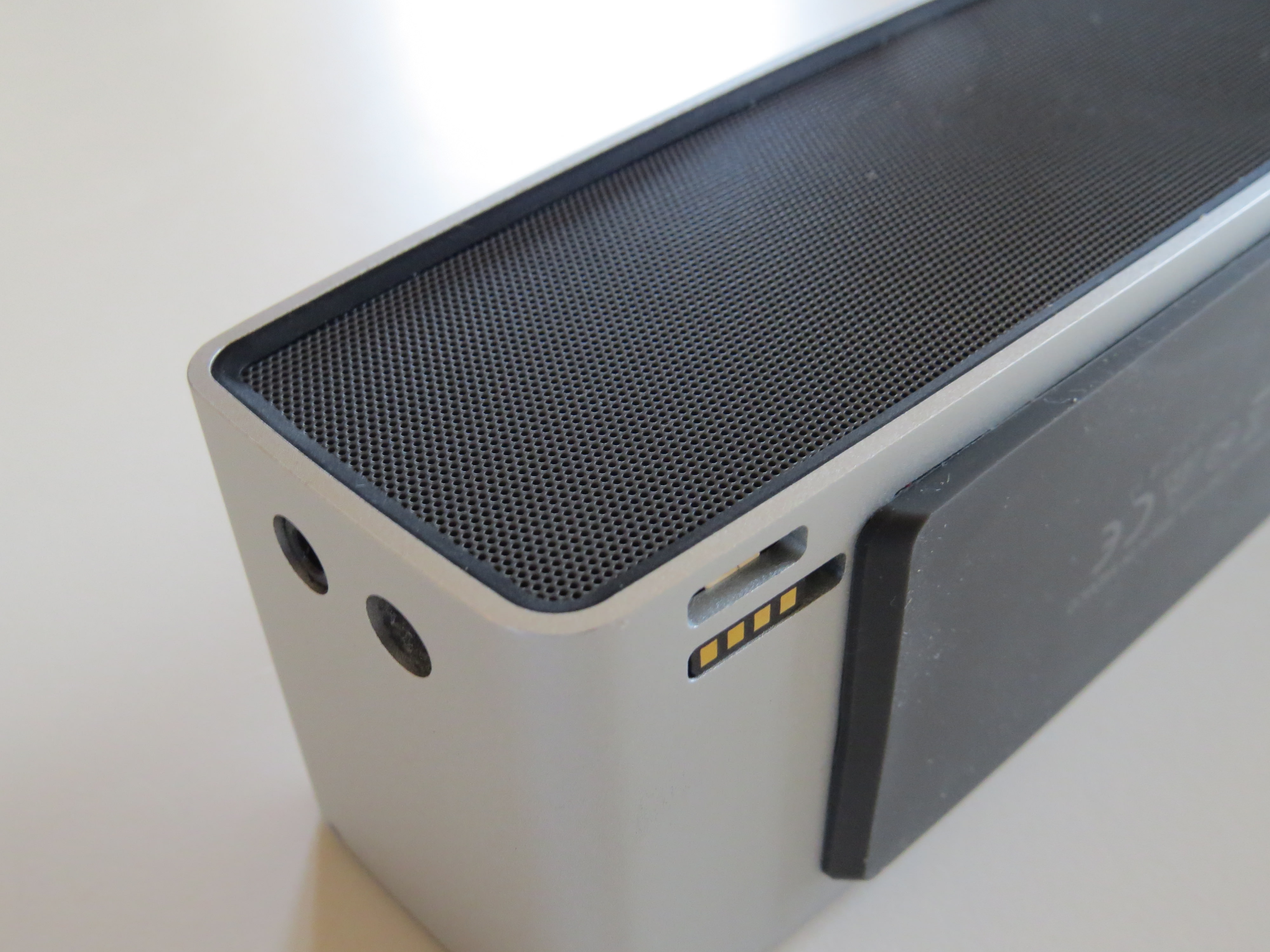 Nella parte superiore abbiamo i tasti di controllo (sono cinque accensione, mute, volume, abbinamento Bluetooth e Aux per ricevere una fonte esterna attraverso una connessione analogica); sul fianco il conettore per jack a 3,5 millimetri e un altro connettore per la batteria nel caso non volessimo usare il dock per la ricarica. Sul fondo c’è anche un connettore micro USB che però può essere usato solo per caricare nuovo firmware e non per caricare la batteria. Manca del tutto un microfono per il vivavoce; un peccato perchè la possibilità di usare l’amplificatore come un sistema vivavoce è una funzione presente in praticamente tutti i dispositivi dei concorrenti, inclusi quelli di qualità inferiore.