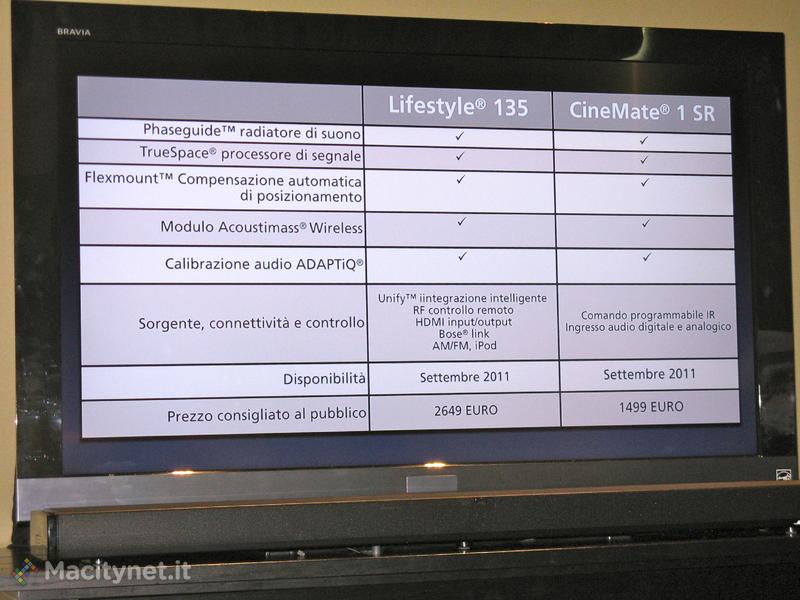Il nuovo diffusore portatile Bose SoundLink Mobile è proposto nella versione base a 299 euro oppure in quella con cover in pelle e rifiniture pregiate a 349 euro: la resa audio è identica nei due modelli. Il sistema home teather LifeStyle 135 è proposto al prezzo di 2.690 euro mentre il CineMate 1SR a 1.499 euro. Per ulteriori informazioni rimandiamo al sito web ufficiale.
