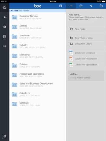 Con l’ultimo aggiornamento, che porta la versione alla numero 3.0, BOX diventa un’app completamente nuova, con un sistema di navigazione e opzioni software del tutto rivisti. Box 3.0 offre una nuova presentazione di documenti, foto e video, rendering dei documenti e caricamento delle foto più rapidi, ricerca in tempo reale di file e anche all’interno dei file, condivisione e comandi migliorati. In più, nei prossimi aggiornamenti, saranno disponibili AirPrint, i segnalibri e l’opzione di salvataggio dei video da Box alla libreria personale dell’utente.
