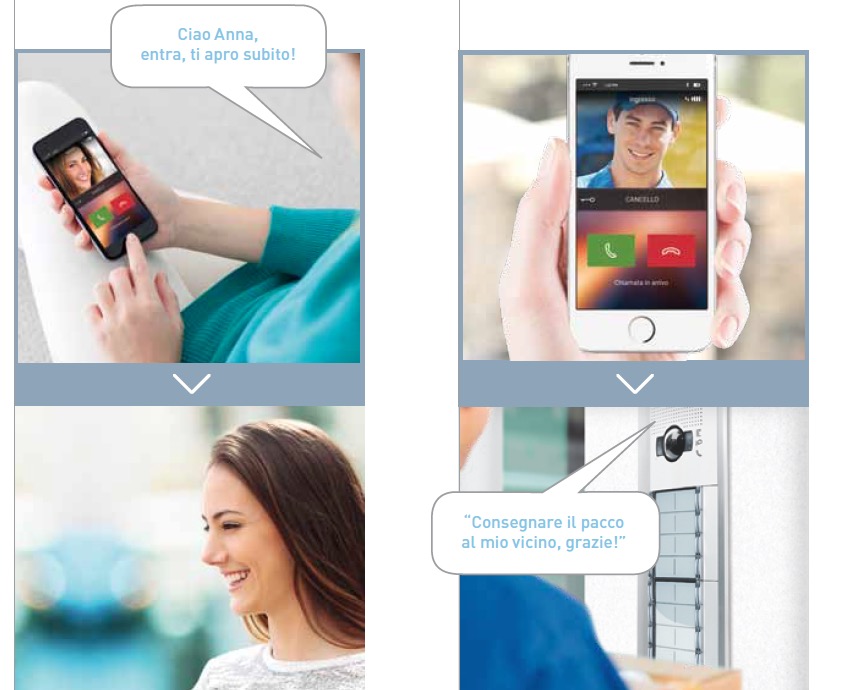 – Possibilità di chiamata audio verso il videocitofono casalingo dal proprio smartphone quando si è l’esterno per colloquiare con il resto degli occupanti l’abitazione con modalità VOIP e durata conversazione di 3 minuti trasparente ai blocchi VOIP degli operatori telefonici