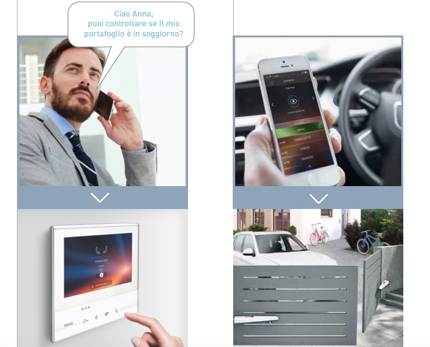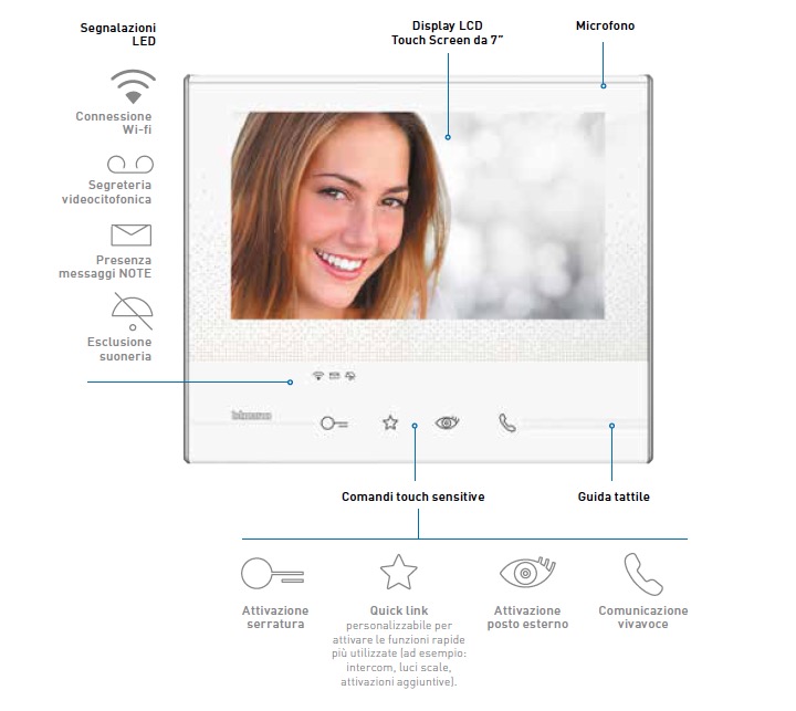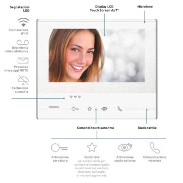 In pratica chi ha già un sistema due fili sarà in grado di sostituire semplicemente la cornetta solo audio o il vecchio ricevitore in bianco e nero con un ampio monitor da sette pollici a colori e aggiungendo una telecamera esterna o ad incasso potrà ottenere tutte le caratteristiche e di interazione di un moderno videocitofono connesso ad Internet.