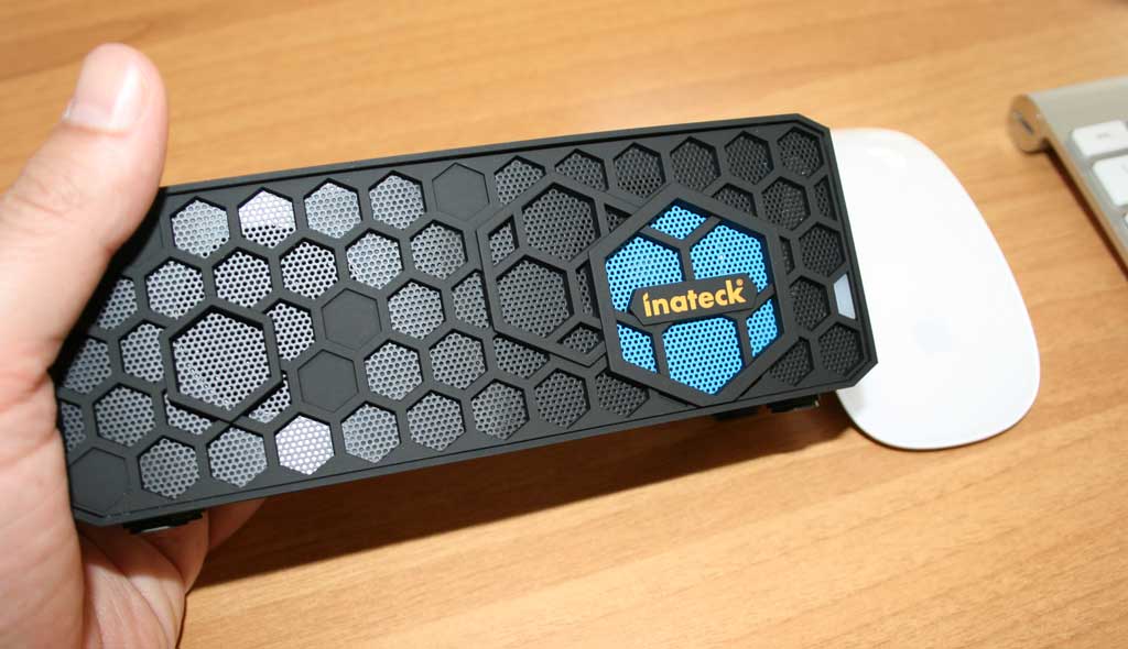 Al primo utilizzo è necessario “accoppiare” il dispositivo; per farlo basta tenere premuto il pulsante Bluetooth per sei secondi: la luce sulla parte frontale lampeggia; sul Mac basta avviare Impostazione Assistita Bluetooth, ricercare il dispositivo e selezionarlo nell’elenco che compare (viene visto alla stregua di una cuffia). Da questo momento in poi è possibile dirottare l’audio sullo speaker selezionandolo dalle Preferenze Suono. Similarmente, sui dispositivi iOS è bastato attivare il Bluetooth e dalle impostazioni abbinare il dispositivo “Inateck BTSP”. Oltre che per riprodurre filmati e brani musicali, con i dispositivi iOS è possibile sfruttare la periferica come sorgente audio anche durante le telefonate (ottenendo, grazie al microfono incorporato, un potente sistema viva voce). La batteria permette di riprodurre musica fino a 5/8 ore secondo il produttore (nei nostri test ha funzionato per circa sette ore). Sono ovviamente supportati anche PC, tablet e qualsiasi altro dispositivo che gestisce l’uscita Bluetooth (quelli che richiedono eventualmente una password sono abbinabili usando codice “0000”).
