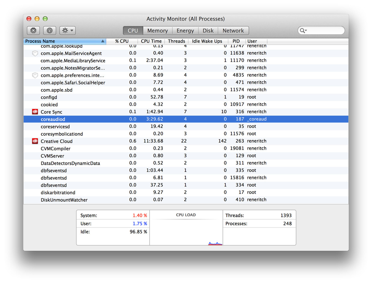 Il lproblema si manfesta con l’assenza completa di audio al risveglio dallo sleep sulle macchine con i chip Haswell, ovvero tutti i computer portatili rilasciati tra la fine dello scorso anno e l’estate. Sono esclusi i MacBook Pro presentati durante l’evento di qualche giorno fa. Quando il bug si manifesta, a niente serve alzare o abbassare il volume, cambiare momentaneamente dispositivi di uscita audio dalle Preferenze di sistema o altro, anche se qualche utente avrebbe ottenuto benefici inserendo e poi scollegando delle cuffie, qualcun altro nel resettare la PRAM. Ma non tutti riescono a risolvere in questa maniera. Un metodo più radicale è attivare Monitoraggio Attività e uscire dal processo “Coreaudioid” oppure riavviare il computer, anche se questo è certamente più lungo e fastidioso da fare.