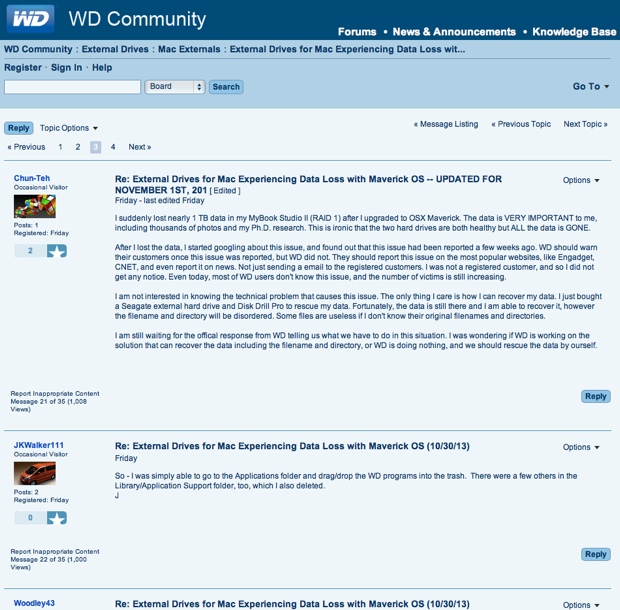 In secondo luogo dopo che il bug si è manifestato WD ha per lo più rilasciato comunicazioni dirette agli utenti registrati: molti utenti di dischi esterni WD non conoscono ancora il problema. Infine OS X 10.9 Mavericks è stato rilasciato il 22 ottobre: ad oggi, 5 novembre, non esiste ancora una comunicazione ufficiale in cui WD spieghi dettagliatamente agli utenti cosa fare, se hanno diritto o meno a un intervento di assistenza o recupero dati. In molti lamentano, per questo, una gestione della vicenda con la rapidità e precisione che la gravità del bug e delle perdite causate agli utenti richiederebbero.