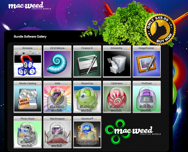I software inclusi nel bundle sono molto popolari ed interessanti: Amnesia; DevonThink 1.9.16, Finance 6; Interarchy; imageFramer; Media Catalog; MacSnapper; SkypeCap; Optimism; ProfCast; Photo Styler; Voila; Sandvox. Inizialmente sono “sbloccati” solo Amnesia, DevonThink 1.9.16, Finance 6, Interarchy, imageFramer e Media Catalog. Gli organizzatori del Macweed Bundle sono riusciti ad abbassare la soglia di pacchetti venduti per poter fornire più probabilità  agli acquirenti di poter acceder anche agli altri interessanti programmi inizialmente bloccati. Così invece di 20.000 bundle occorre raggiungere solamente 2.000 pezzi venduti per ottenere Voila. A 5.000 bundle venduti saranno sbloccati anche MacSnapper, SkypeCap, Optimism, ProfCast e Photo Styler. Infine, al superamento dell’ambiziosa soglia dei 40mila bundle venduti gli acquirenti avranno anche Sandvox.