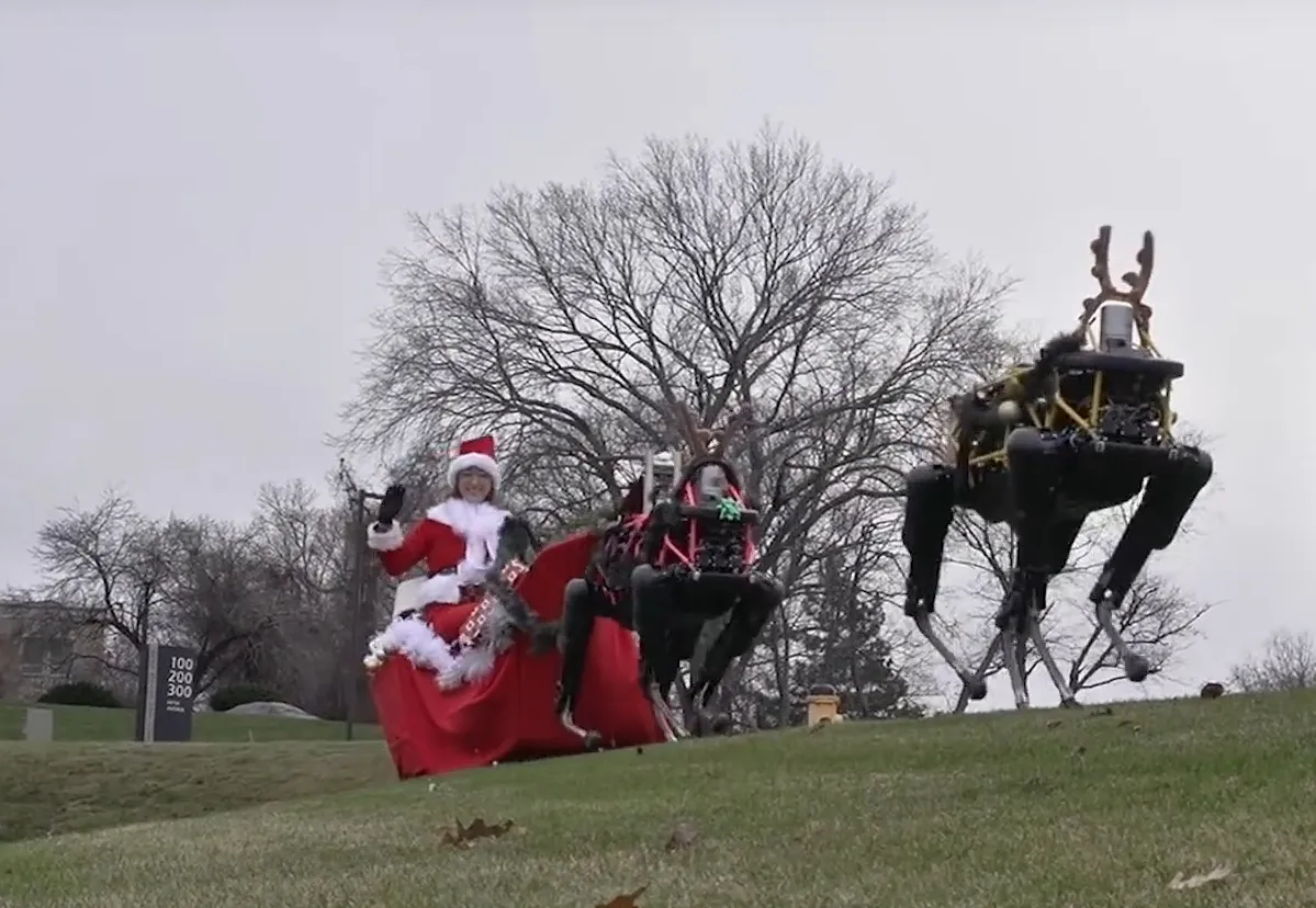 La parte più interessante è ovviamente la forza motrice, al posto delle renne infatti ci sono tre inquietanti robot a quattro zampe che procedono sicuri ma con andamento decisamente poco naturale. Si tratta dei robot battezzati Spot in grado di muoversi agevolmente anche su terreni sconnessi e di tornare da soli in equilibrio anche dopo urti e collisioni. Qualità fondamentali per poter consegnare i regali di Natale ovunque nel mondo.