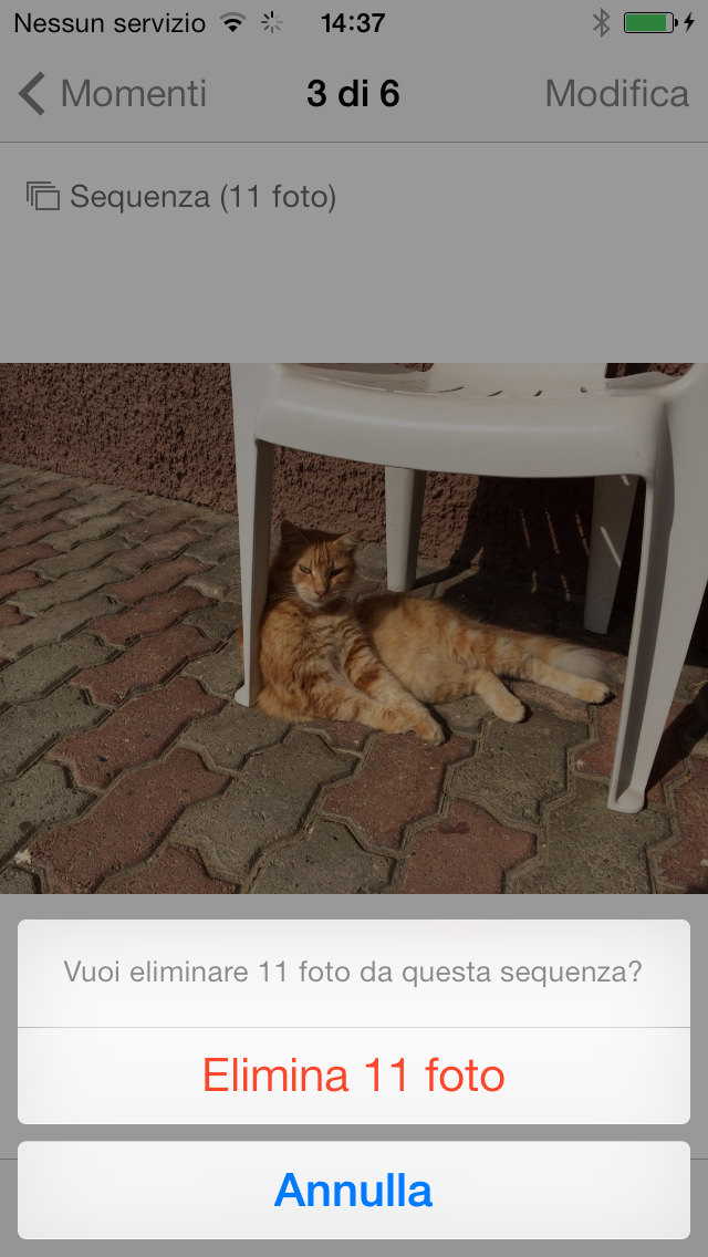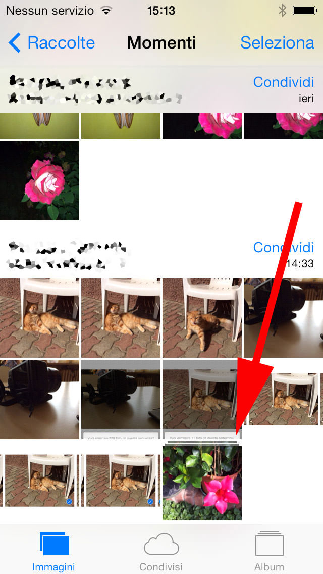 Una volta scattata la sequenza di immagini, iPhone 5s ci presenterà non tutte le foto scattate, ma solo una. L’icona dell’immagine sarà però diversa dalle altre foto che abbiamo scattato a click singolo, perché simulerà una pila di foto sopra la quale si trova quella scelta. Toccando la foto avremo la foto prescelta da iPhone in versione ingrandita. Toccando la scritta “scegli preferite” avremo la possibilità di vedere tutte le altre foto scorrendo un carosello simile ai frames di un filmato nella parte bassa dello schermo, oppure le anteprime ingrandite nella parte centrale dello schermo. La foto scelta da iPhone sarà designata da un pallino grigio nel carosello. iPhone 5s ci offrirà la possibilità di scegliere le foto migliori, siano quella scelta dal processore che altre che sono state collocate non in rilievo. Ciascuna foto prescelta da noi sarà contraddistinta da un segno di spunta ed estratta dalla sequenza e presentata come foto singola. A quel punto, scelte le migliori magari poi da verificare su un display più grande, potremo decidere di cancellare tutte le foto che non ci servono per liberare memoria.