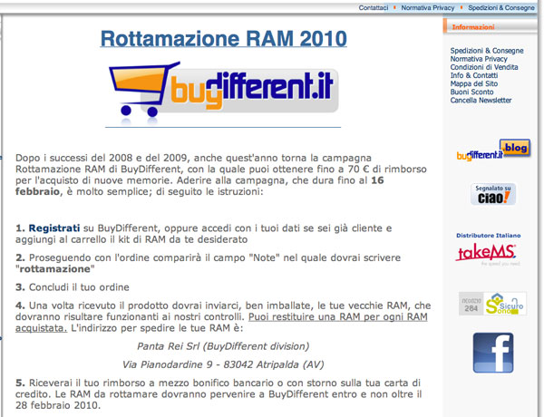 Su BuyDifferent è iniziata la Campagna Rottazione RAM 2010: gli utenti Mac possono ottenere un rimborso fino a un massimo di 70 euro cedendo a BuDifferent i vecchi banchi di memoria. Il buono sconto ottenuto può così essere utilizzato per l’acquisto di nuove memoria RAM per potenziare il nostro Mac.