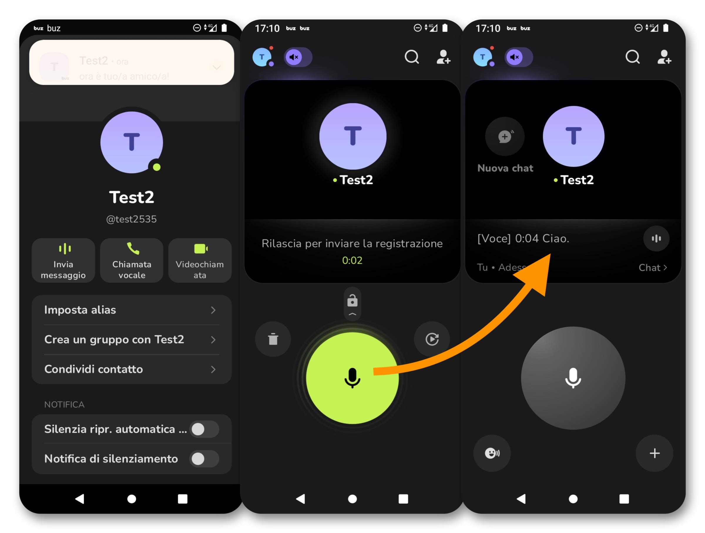 Rilasciandolo, il messaggio viene trasmesso al destinatario – o ai destinatari, se si tratta di una chat di gruppo – ed è riprodotto automaticamente anche a schermo bloccato (se il dispositivo ricevente è stato configurato in questo modo).
