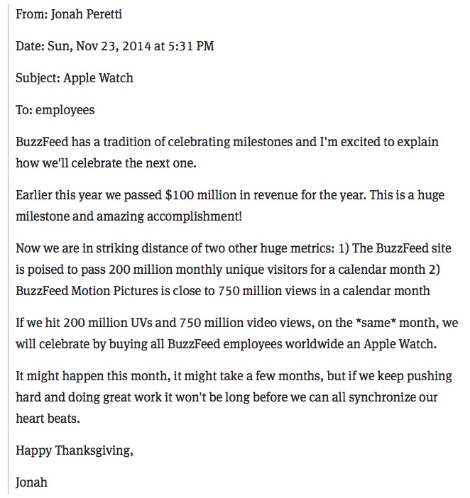 Apple Watch per ogni membro dello staff di BuzzFeed. Un regalo da 350 dollari quello che farà l’azienda ai propri dipendenti se saranno raggiunti 200 milioni di visitatori unici e superati 750 milioni di visualizzazioni video in un mese. Ad annunciarlo lo stesso CEO Jonah Peretti con una mail ai collaboratori, che alleghiamo in calce all’articolo, rendendolo noto pubblicamente attraverso un tweet dal proprio account ufficiale.