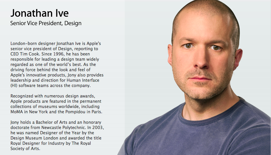 Ora, anche formalmente, Ive è il responsabile del nuovo volto di Apple. L’incarico di disegnare il look, lo stile, l’interfaccia umana, non solo dei dispositivi hardware ma anche dei sistemi operativi di Cupertino, viene messo nero su bianco nella sezione ufficiale con le biografie dei manager.