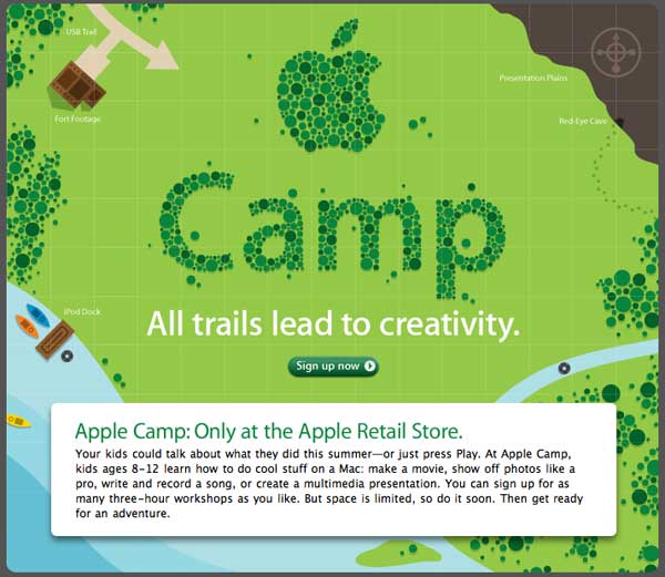 Con l’arrivo dell’estate Apple ripropone ai ragazzi il Campo Estivo: i negozi Apple store aprono le porte ai ragazzi per corsi completi di 3 ore ciascuno che illustrano come creare e gestire foto, film, musica e presentazioni con le soluzioni hardware e software della Mela. Cupertino propone l’iniziativa Campo Estivo negli Stati Uniti, in cui la catena Apple Store conta oltre 200 punti vendita sparsi per tutto il Paese, e anche in altre nazioni. In Italia al momento è disponibile un solo Apple Store che si trova a Roma che aderisce all’iniziativa.
