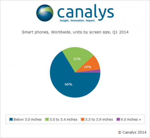 Primo quarto del 2014: le spedizioni di Android raggiungono quota 81%, quelle iOS si attestano al 16% iOS, mentre il 3% è di competenza Microsoft e dei suoi Windows Phone. Non è questa, però, la notizia più rilevante che si può ricavare dai dati diffusi da Canalys. La novità è che circa il 34% del totale è formato da dispositivi con schermo da 5 o più pollici. Cresce, insomma, la febbre da phablet, sempre più apprezzati dagli utenti, anche a scapito della manegevolezza.