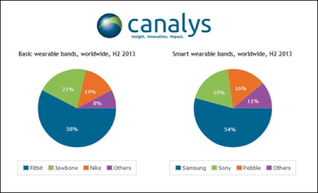 Pur essendo ancora agli albori i bracciali con sensori vengono distinti in due categorie: quelli basic, dal prezzo abbordabile e dotati di sensori e funzionalità di base per lo sport e la salute, contrapposti ai modelli smart, in pratica veri e propri computer da polso proposti a prezzi superiori. Nel primo segmento domina Fitbit con i bracciali basic Flex and Force con una quota di mercato del 58%, seguita da Jawbone con il 21%, Nike al terzo posto con il 14% e il rimanente 8% suddiviso tra i player minori.