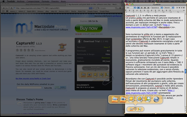 Ricordiamo che con CaptureIt è possibile anche riprendere filmati del movimento del puntatore sullo schermo, dell’esecuzione di altri programmi o giochi, utile per creare dimostrazioni, presentazioni, tutorial e molto altro ancora. CaptureIt! è proposto al prezzo di listino di 20 dollari, circa 15 euro. Grazie alla promozione MacUpdate è possibile acquistarlo ancora per poche ore al 45% di sconto, per un prezzo di 11 dollari, praticamente 9 euro.