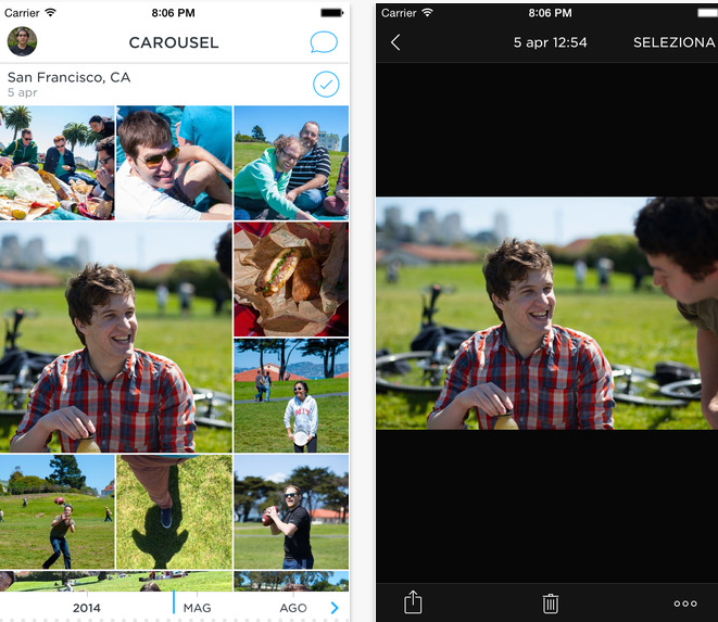 La nuova versione 1.7, rilasciata in App Store in data odierna aggiunge il supporto al grande schermo di iPad, adattando l’interfaccia grafica alla risoluzione nativa del tablet Apple. Il funzionamento è, ovviamente, identico a prima, quando l’app era esclusiva iPhone. Ed infatti, man mano che si scattano foto e si registrino video, Carousel li salva automaticamente sul proprio accaount Dropbox, così da mettere al sicuro in un unico posto tutti i propri ricordi. Nonostante la principale novità della nuova versione sia l’interfaccia nativamente adattata per iPad, il nuovo Carousel offre nuove interessante funzioni: su tutte, la possibilità di inviare e condividere le foto su Instagram e WhatsApp. Si tratta di un’interessante funzione, che permette di condividere le foto di Carousel anche con applicazioni terze, che solitamente sono precluse quando si tenta di condividere una foto ripresa dalla galleria nativa di iOS. Al di là delle nuove funzionalità, è la semplicità nell’organizzazione delle foto a rendere l’applicativo un ottimo strumento per mettere al sicuro le proprie foto.