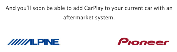 Cupertino riconosce ufficialmente il supporto delle funzionalità offerte dal proprio sistema di iOS in the car anche su soluzioni aftermarket di altre aziende di Alpine e Pioneer con un “And you’ll soon be able to add CarPlay to your current car with an aftermarket sistem”.