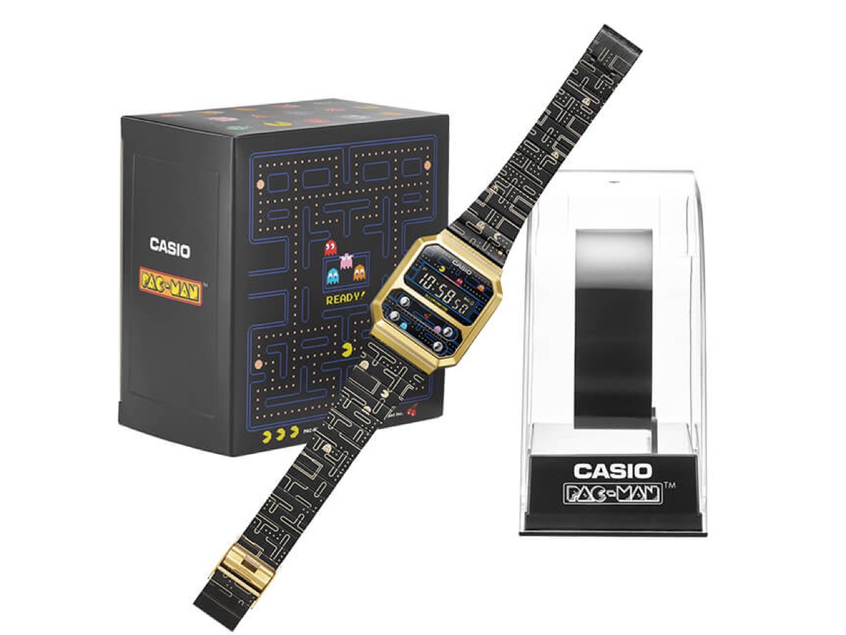 Il nuovo Casio A100WEPC ne imita la stessa disposizione a quattro pulsanti mentre sul quadrante presenta i personaggi di Pac-Man a colori, compresi i quattro fantasmini Blinky, Pinky, Inky e Clyde, rispettivamente di colore rosso, rosa, blu e arancione; il logo della funzione illuminator inoltre è scritto con lo stesso font del videogioco. Tutta la scena rappresentata nel quadrante richiama la classica schermata di gioco di Pac-Man, mentre sulla parte esterna del cinturino è incisa al laser una scena di gioco della versione classica in giallo e nero. A completare il tutto c’è una confezione speciale sulla quale sono rappresentati i personaggi di Pac-Man e la schermata dei punteggi di gioco.