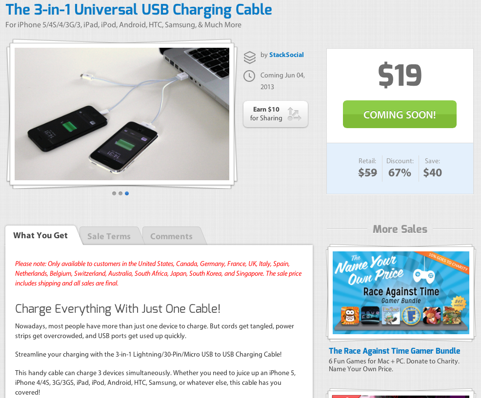 Il prezzo di listino del cavo speciale è di 59 dollari, circa 45 euro: grazie allo sconto è possibile acquistarlo con Stacksocial a soli 19 dollari, circa 14 euro.