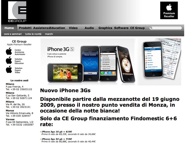 L’occasione è ghiotta per tutti gli appassionati della Mela che vivono o abitano vicino a Monza e che desiderano provare in anteprima o acquistare il nuovo smartphone della Mela. Oltre allo smartphone più atteso degli ultimi mesi presso CE Group di Monza, in via Vittorio Emanuele 8, telefono 039.328.447, è possibile trovare tutte le novità che riguardano iPhone 3GS, incluse nuove custodie e accessori. Per chi fosse interessato all’acquisto ricordiamo che è anche possibile il pagamento con finanziamento Findomestic di 12 rate: per iPhone 3GS da 16GB 6 rate da 69,33 euro e 6 rate da 34,66 euro oppure per iPhone 3GS da 32GB 6 rate da 80,88 euro e 6 rate da 40,44 euro. Per tutte le informazioni rimandiamo al sito Web di CE Group.