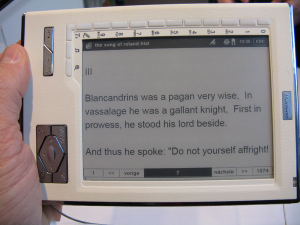 Nella folla che oggi ha preso d’assalto la manifestazione IT occorre attendere pazientemente in fila prima di poter provare uno dei 4 modelli di lettore ebook in mostra presso lo stand Hanvon. Si parte dal modello base WISEreader N516: il costruttore assicura che grazie alla tecnologia E-ink è possibile scorrere fino a 8mila pagine con una sola ricarica. Il modello base è proposto a circa 150 euro, mentre quello superiore WISEreader N518 dotato di stilo e riconoscimento della scrittura al prezzo di 200 euro.