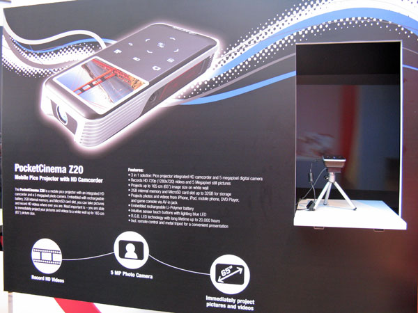 Nello stand Aiptek del CeBIT è possibile provare diversi nuovi prodotti che saranno rilasciati più avanti nel corso dell’anno. Famosa per i propri dispositivi digitali tascabili per registrare video e scattare foto, Aiptek mostra nello stand PocketCinema Z20, il primo videoproiettore tascabile che permette di registrare video HD (1280×720 pixel) e scattare foto a 5 megapixel. Una volta catturati filmati e/o foto è possibile proiettarle direttamente su una parete sfruttando uno schermo che arriva fino a 65 pollici.