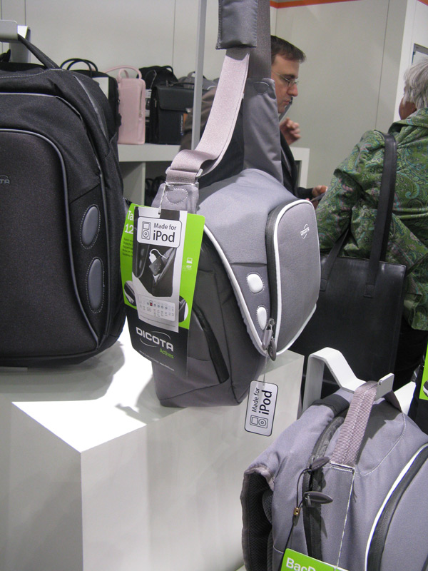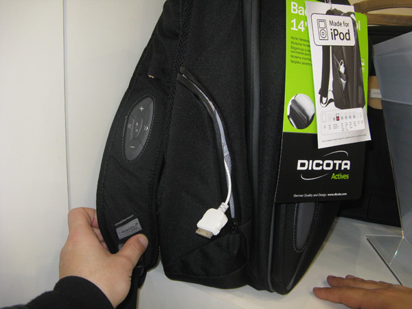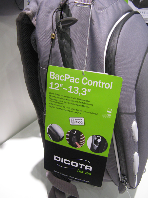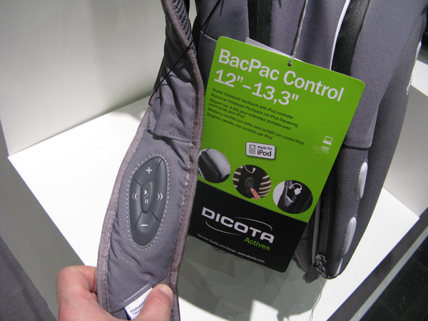 Presso lo stand Dicota Macitynet ha concentrato l’attenzione sui due nuovi TakeControl e BacPac Control. Oltre ad ospitare il notebook e proteggerlo dalla pioggia, la borsa e lo zaino Dicota offrono un alloggiamento imbottito per ospitare iPod dotato di un cavo di collegamento integrato nella borsa. Grazie a questo collegamento l’uscita per gli auricolari e tutti i comandi principali sono poi riportati sullo spallaccio. Questa tecnologia è stata utilizzata in precedenza da Simpak-