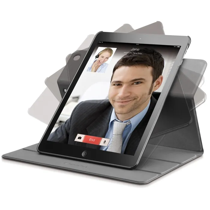 Questa soluzione offre massima libertà agi utenti iPad che possono così non solo utilizzare il tablet in orizzontale, ma anche ruotare liberamente il supporto per orientare iPad in verticale. In questo modo è possibile utilizzare le app di videochat, i videogiochi e tutte le altre app che sfruttano l’orientamento in verticale, evitando posizioni poco sicure o di dover estrarre il tablet dalla cover.
