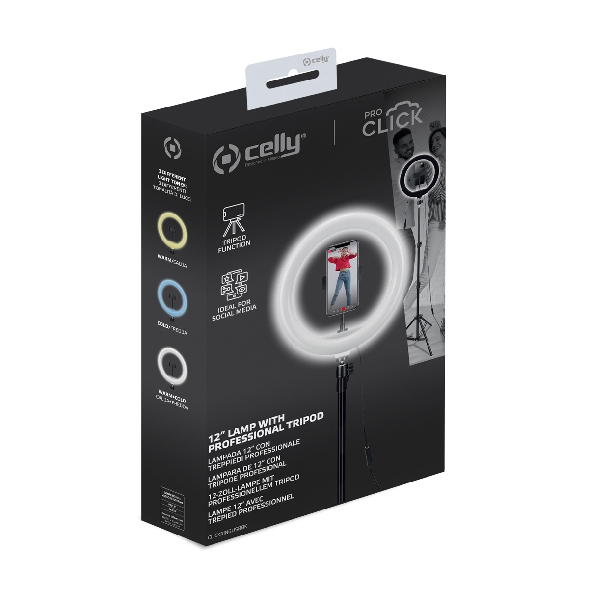L’altra soluzione presentata dall’azienda si chiama Celly Clickring USB e come dicevamo in apertura è progettata principalmente per l’uso in studio o comunque in tutte quelle situazioni in cui la fotocamera si trova in posizione fissa. E’ una lampada anulare di dimensioni più generose (ha un diametro di 12″, circa il doppio rispetto a quella del modello BT) che viene accompagnata da uno stativo la cui estensione massima è pari a 160 centimetri. L’alimentazione della lampada avviene collegandola a un alimentatore da parete o a una powerbank attraverso il cavo USB da 2 metri in dotazione. Il prezzo è di 34,99 euro.