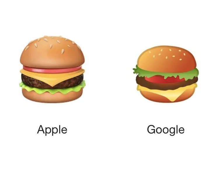 Per quanto riguarda il pittogramma che mostra l’hamburger, c’è un po’ di confusione. Apple lo guarnisce (correttamente) con la fetta di formaggio sopra la carne. Non tutti sono concordi sull’ordine degli ingredienti e Google, ad esempio, ha creato un pittogramma con il formaggio inserito sulla fetta in basso del panino. Sembra una polemica da niente ma Sundar Pichai, l’attuale amministratore delegato di Google, in un tweet dice che si tratta di un errore spiegando che un aggiornamento è in arrivo.