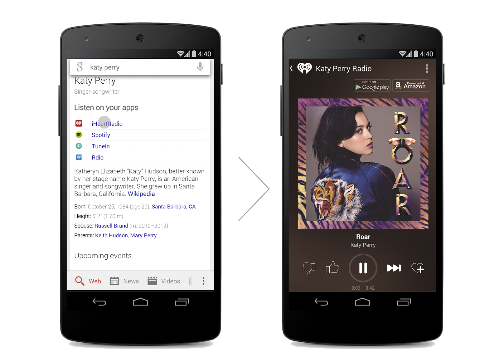 Google ha presentato una nuova e interessante funzionalità del suo motore di ricerca: cercando un artista o un brano musicale, ora fra i risultati verranno mostrati anche i collegamenti alle applicazioni installate. Con un singolo tap sarà possibile scegliere quale app lanciare e iniziare subito l’ascolto dei brani e della musica appena ricercata. Questa funzionalità, annunciata sul blog ufficiale, è al momento disponibile solamente per i dispositivi Android, per le ricerche effettuate sul territorio USA e per alcune applicazioni, fra cui YouTube, Spotify, iHeartRadio, e ovviamente anche Google Play Music.