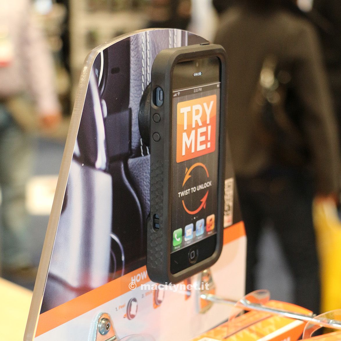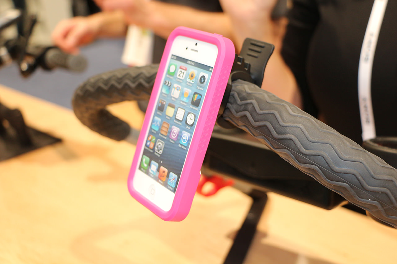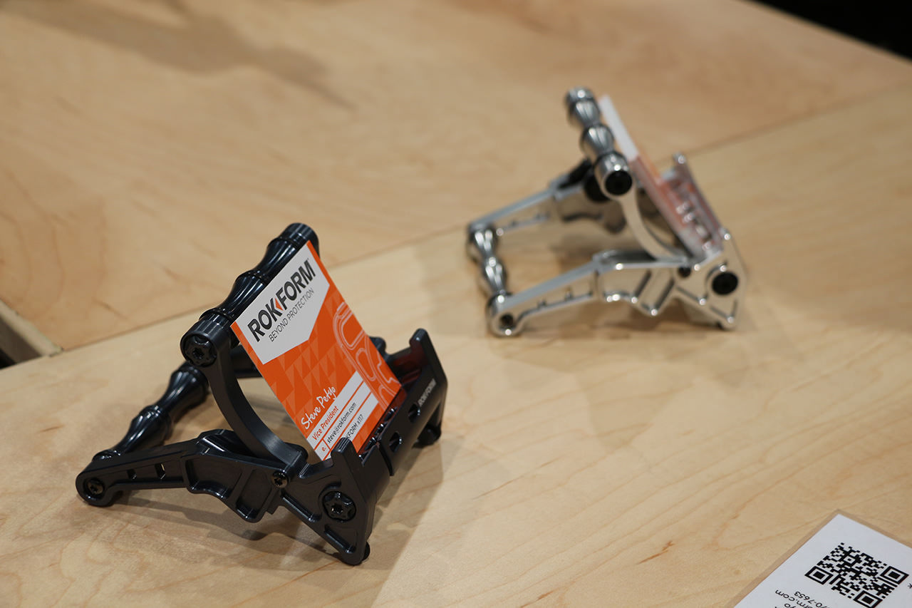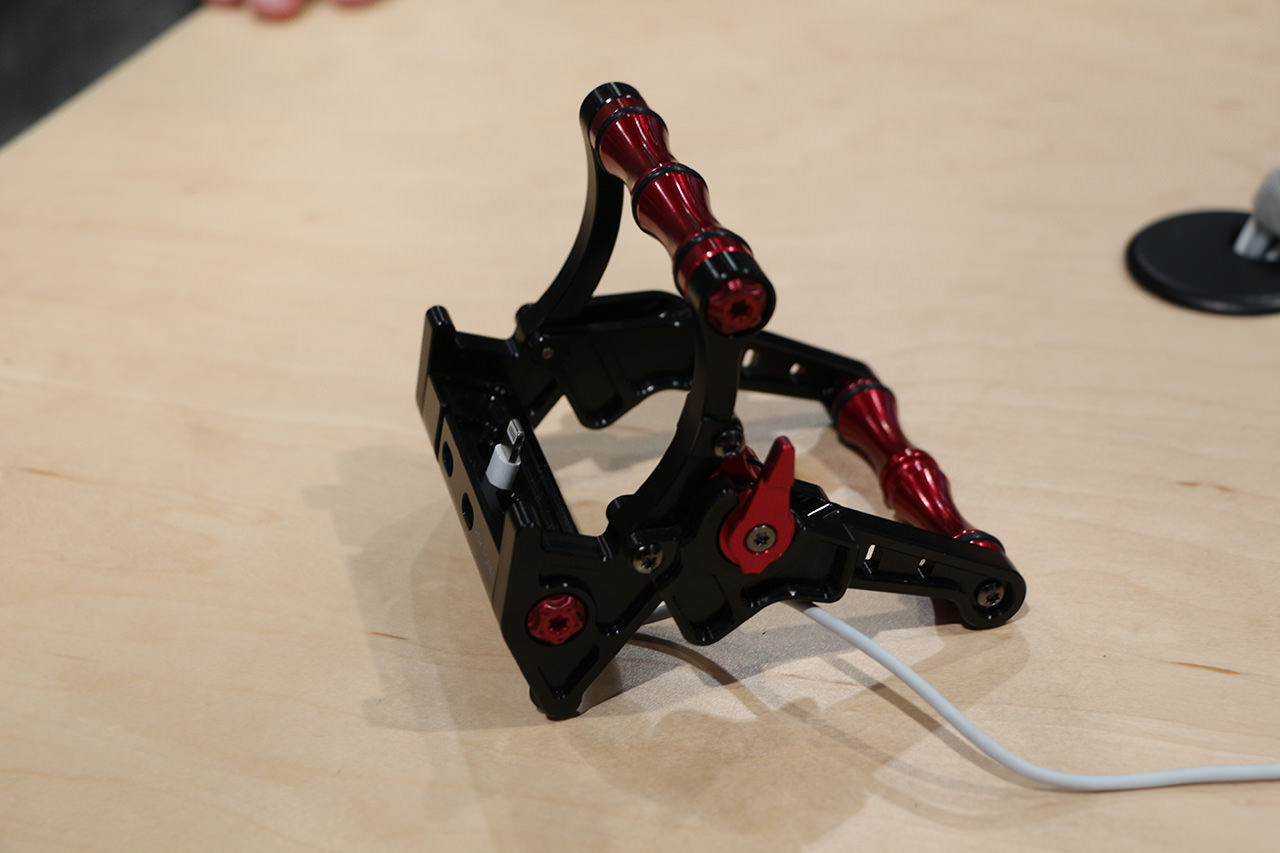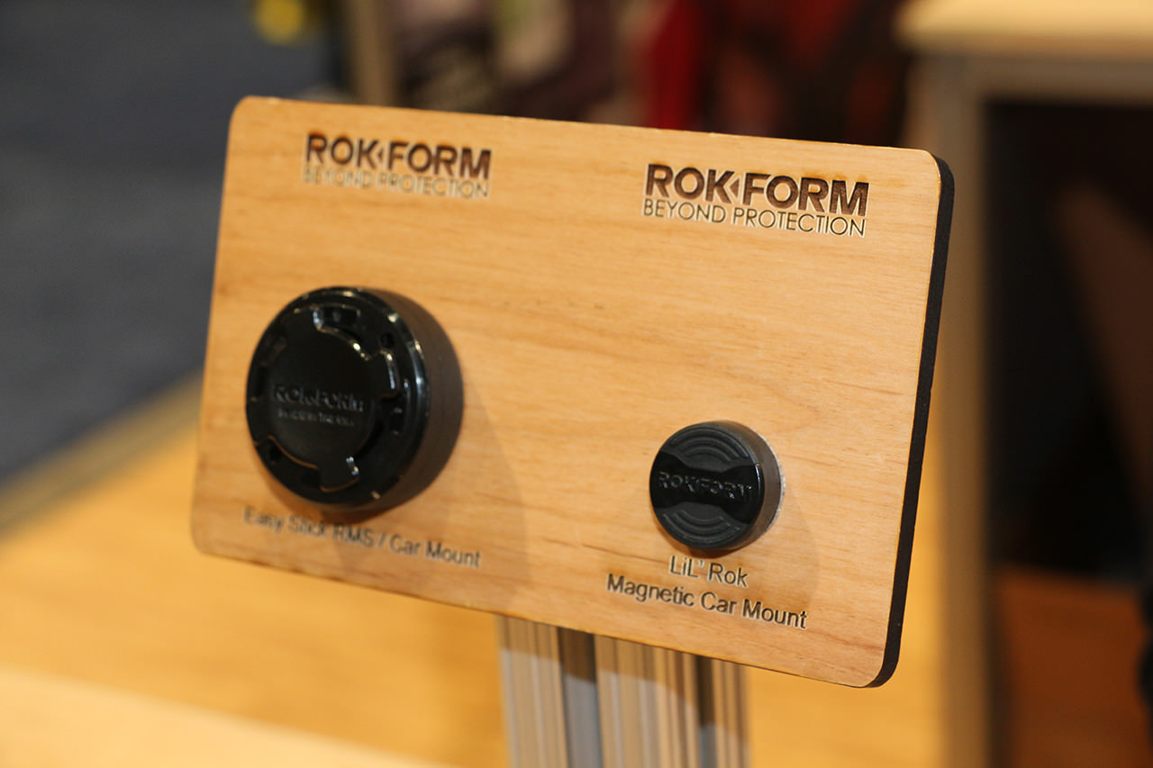 Un altro interessante produttore di supporti è RokForm. Nello stand sono visibili custodie con connettore a scatto e sistema di montaggio multiplo su un aggancio magnetico. RockForm produce anche supporti per biciclette e per moto basati sullo stesso meccanismo di aggancio.