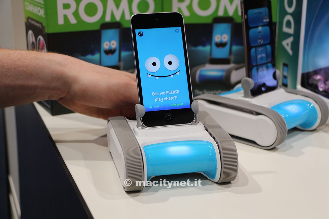 Romo è un piccolo robot che ha come viso lo schermo di iPhone e una base robotica rotante dotato di personalità e curiosità: girerà per casa, farà giochi semplici con i bambini e incanterà anche i più grandi. Romo, con la sua base robotica controllata da iPhone, è il nuovo prodotto di Romotive presentato al Ces 2014.
