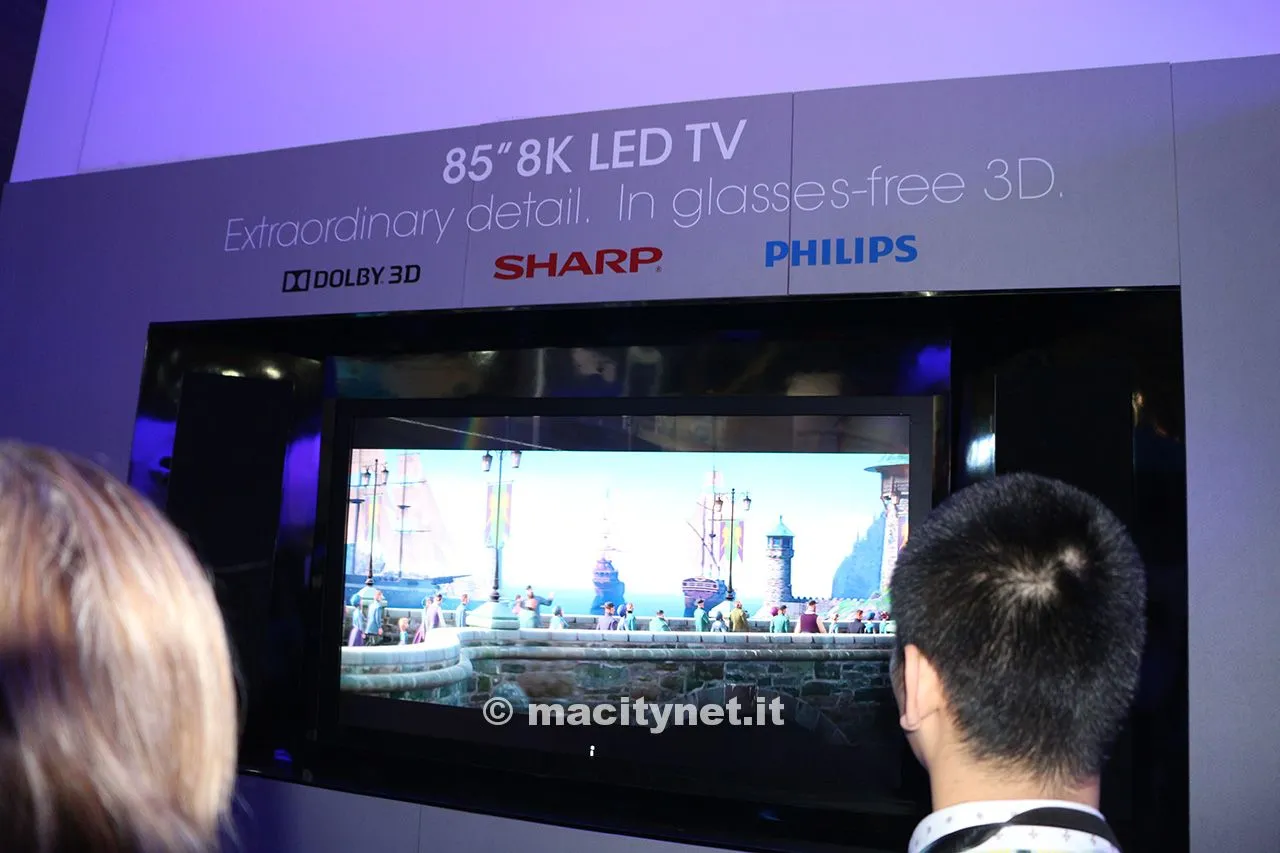 All’international Consumer Electronics Show (CES) di Las Vegas, Sharp h mostrato la prima TV 3D con risoluzione 8K che non richiede l’utilizzo di speciali occhiali 3D. Il display 8K4K (risoluzione 7,680 x 4,320 pixel), è stato sviluppato congiuntamente con Philips e i Dolby Laboratories e sfrutta la tecnologia di conversione Dolby 3D multiview che permette allo spettatore di visualizzare immagini 3D senza bisogno di indossare occhiali dedicati.