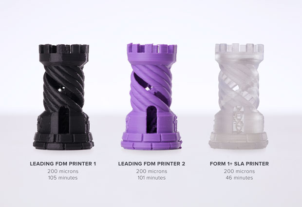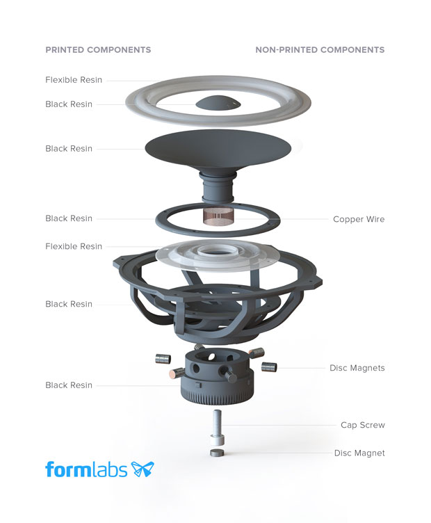 La società Formslab mostrava la versione aggiornata de software per la stampa 3D Form 1+ con rilevanti miglioramenti in termini di velocità e funzionalità, tra le altre cose ora in grado di stampare in modalità bozza (“draft mode”) accelerando la stampa senza o con dettagli fino a 200 micron. Il tutto è molto interessante soprattutto in virtù del lancio del mese scorso di una resina flessibile come materiale di stampa per il loro dispositivo. Una nuova architettura (“Smart Support”) permette ai sistemi di questo produttore di usare il 60% di materiale in meno. Un modello di esempio (la classica torre degli scacchi) è stato stampato in meno della metà del tempo richiesto prima sfruttando le stampanti FDM. La società ha anche mostrato uno speaker creato quasi interamente con stampanti 3D (tutto è stato creato “in casa”, eccetto pochissimi elementi) usando nuove resine flessibili e la resina nera lanciata lo scorso anno.