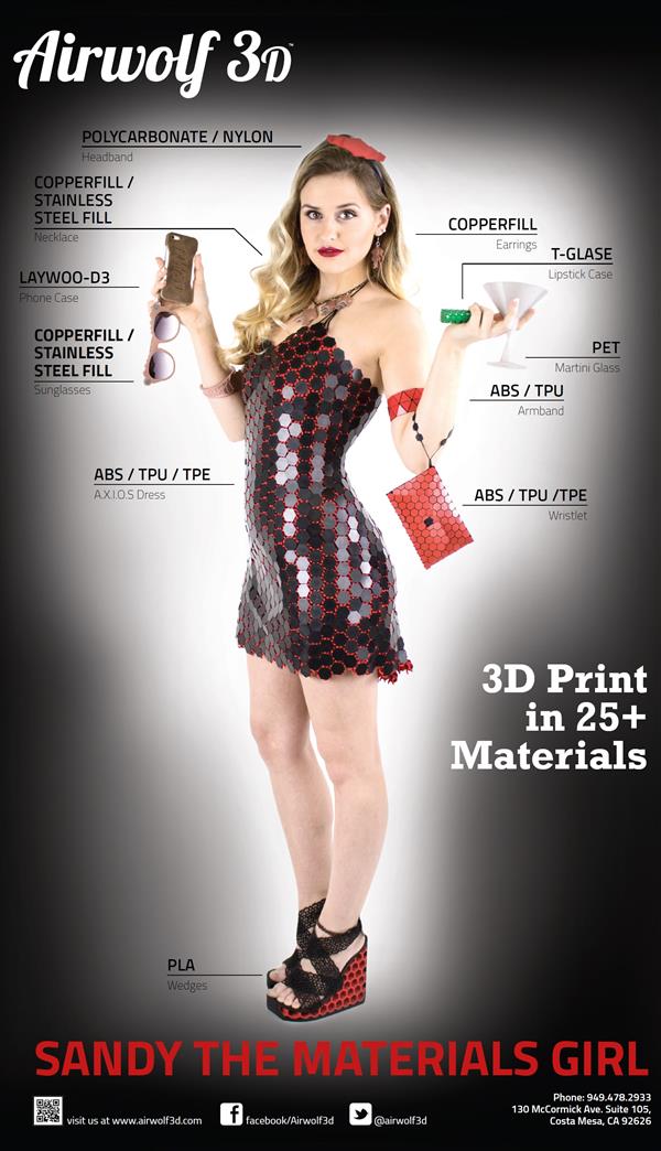 La nuova s stampante desktop 3D AW3D HD-R di AirWolf (4595$) permette di stampare capi d’abbigliamento e accessori. Per distinguersi dai vari espositori presenti a Las Vegas, nello stand dei californiani erano ogni due ore organizzate sfilate con Sandy, una ragazza che indossava vari capi d’abbigliamento e accessori stampati in 3D. L’abito “AXIOS Dress” è stato progettato su misura per la ragazza da Cameron Williams, è realizzato in ABS Wolfbend TPU e TPE, con materiali che costano in tutto circa 78 dollari.
